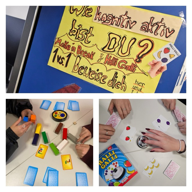 Die Gruppe „Pausenspiele“ informierte mithilfe von Plakaten über die negativen Folgen dauerhafter Handynutzung und lud in zwei Pausen zu schnellen Mitmachspielen für ein effektives Gehirnjogging ein.